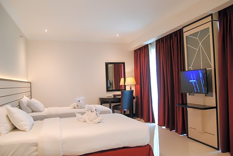 The spacious triple room offers air conditioning, soundproof walls, as well as a private bathroom featuring a walk-in shower and a bidet. This wheelchair accessible triple room features executive lounge access, a seating area with a flat-screen TV and a higher level toilet. The unit offers 2 beds.